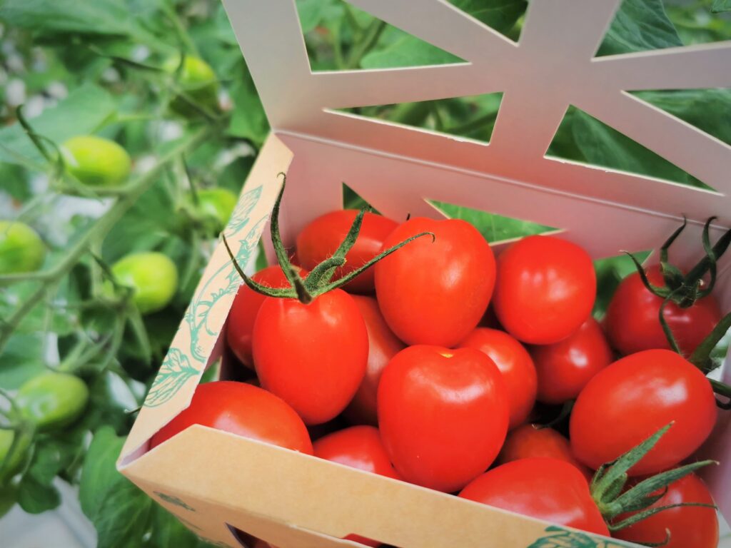 Vi försöker hela tiden tänka nytt och göra bättre. Ett exempel är att vi packade i plastaskar när vi började odla tomater, för det fanns inte något alternativ. Förra året kunde vi ta fram en ask gjord i papp med råvara från svenska skogar. Den är tillverkad i Skåne och är betydligt bättre för miljön. Dessutom är den ursnygg!